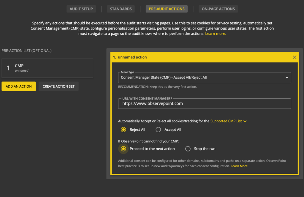 ObservePoint users can automatically test if their Consent Management Platform is working properly in an “accept all” or “reject all” state. This feature is available for the following CMP providers: OneTrust/CookiePro, TrustArc, Tealium, CookieBot, UserCentrics, Cookie Control, Didomi, and Ensighten.