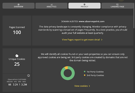 Last but not least, the Use Case Overviews give ObservePoint users at-a-glance insights based on their main role or department. Available for Analytics, Privacy, and Landing Page use cases, this default view allows you to quickly scroll through Audit findings that are likely most valuable to you.