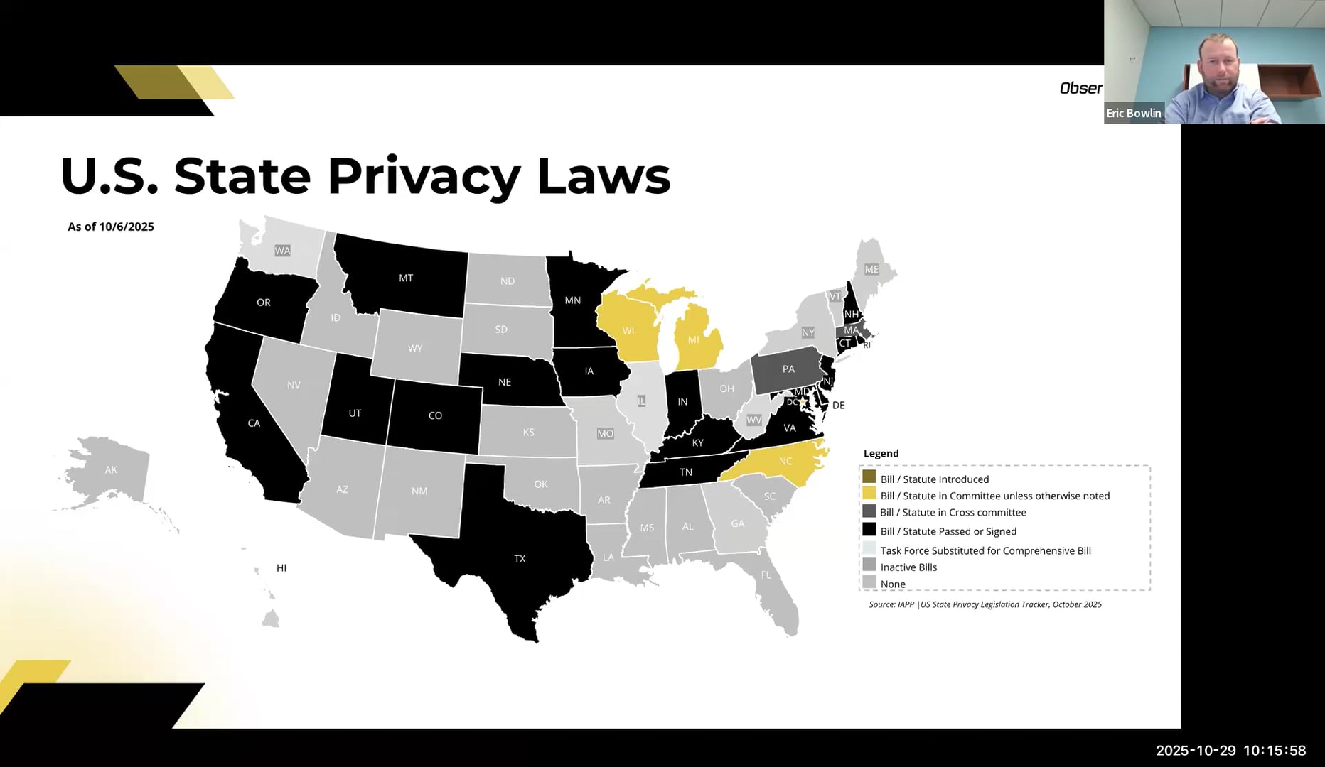 One thing to keep in mind: government is usually a few years behind in learning how to actually enforce these laws. They'll pass the law and want change to happen, and enforcement comes once they see how it's implemented and where compliance stands. I participated in a panel at the National Association of Attorneys General last year, and I've also been on a panel with our Utah AG — there is active movement toward coordination between state AGs on how to do better enforcement around data governance and privacy. The industry has matured enough that I think you'll start to see more standardized enforcement approaches across states. Now is definitely the time to get your programs in place.